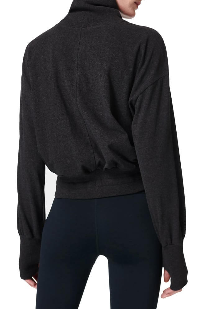 An adjustable drawstring cinches the wide hemline of this comfort-first fleece pullover with a slouchy turtleneck and thumbhole cuffs.